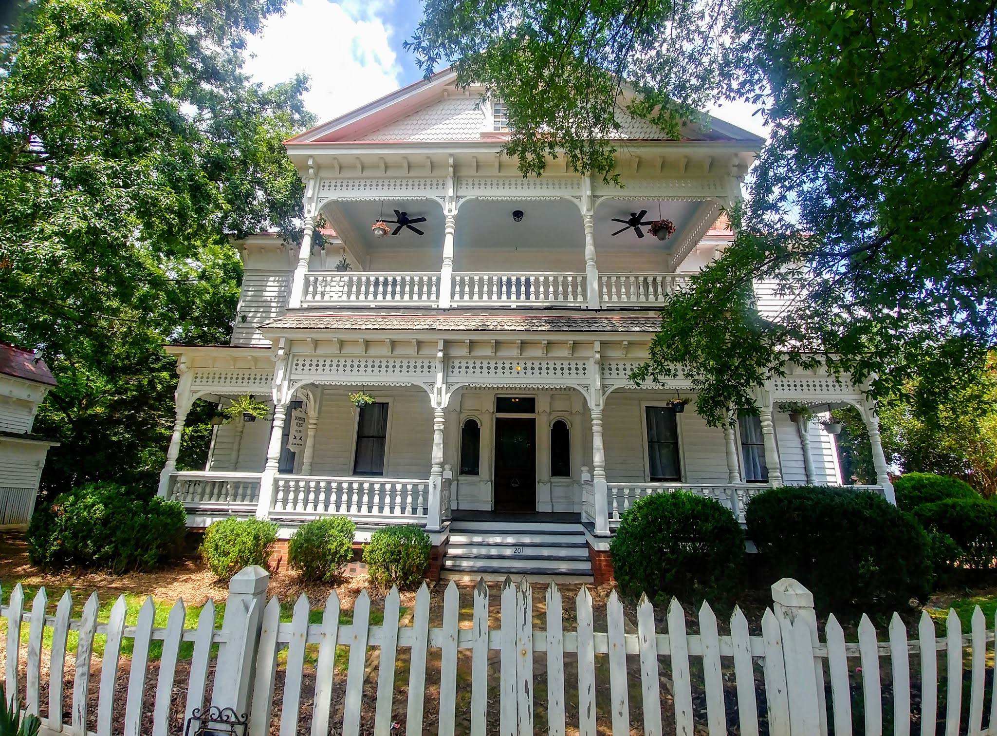We walked down E. Jefferson Street and saw the Rogers House and Rose Cottage. The Rogers House was built in 1809 and is one of the oldest homes in Madison. This home was built right when Madison was established. Reuben Rogers purchased lot #6 out of 48 lots, for $111 and built his two story wooden home in a Piedmont plan style. The home was finished in 1810 and is standing where it did all those years ago. This is the last home standing from the original 48. The home has beautiful decorative touches and a lovely front porch with two gorgeous pink Crape Myrtle trees adorning either side of the front door.
